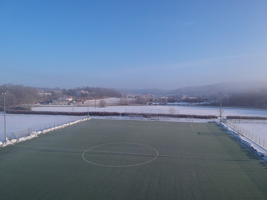 En fotbollsplan omringad av vinterlandskap. Försäsong och februarifotboll. Underbart!